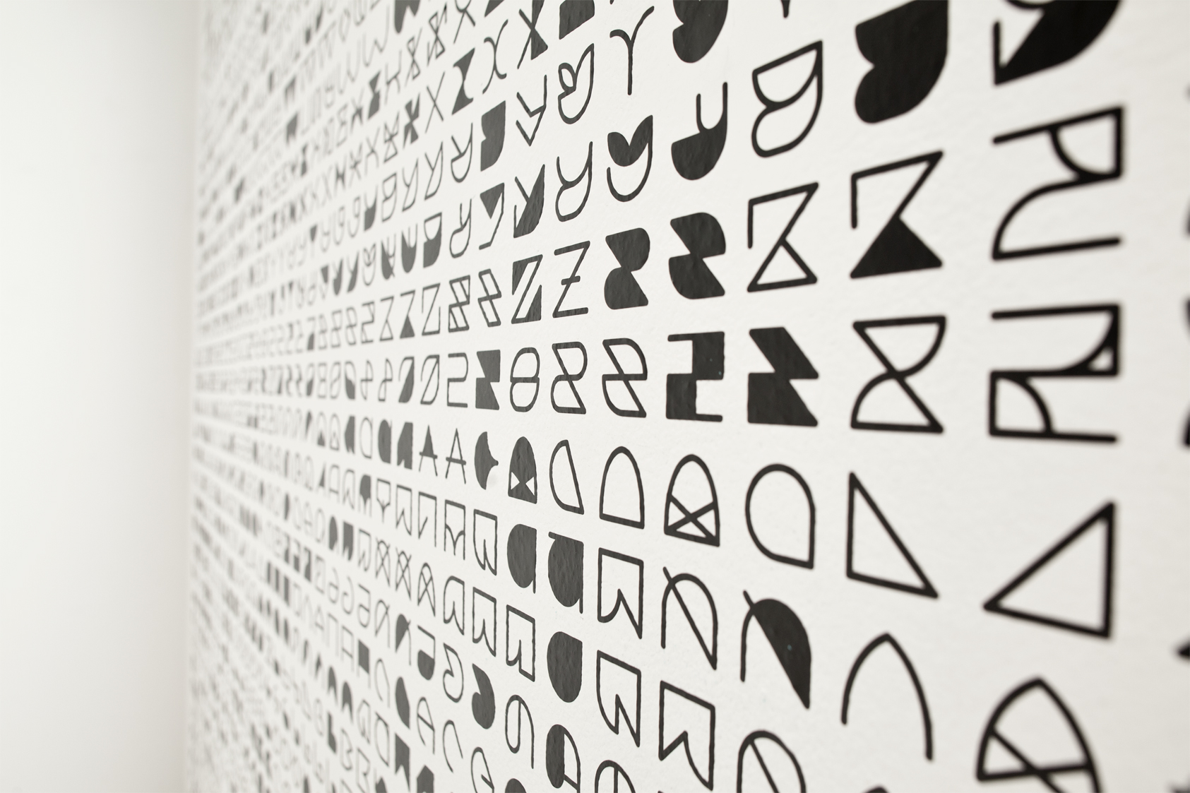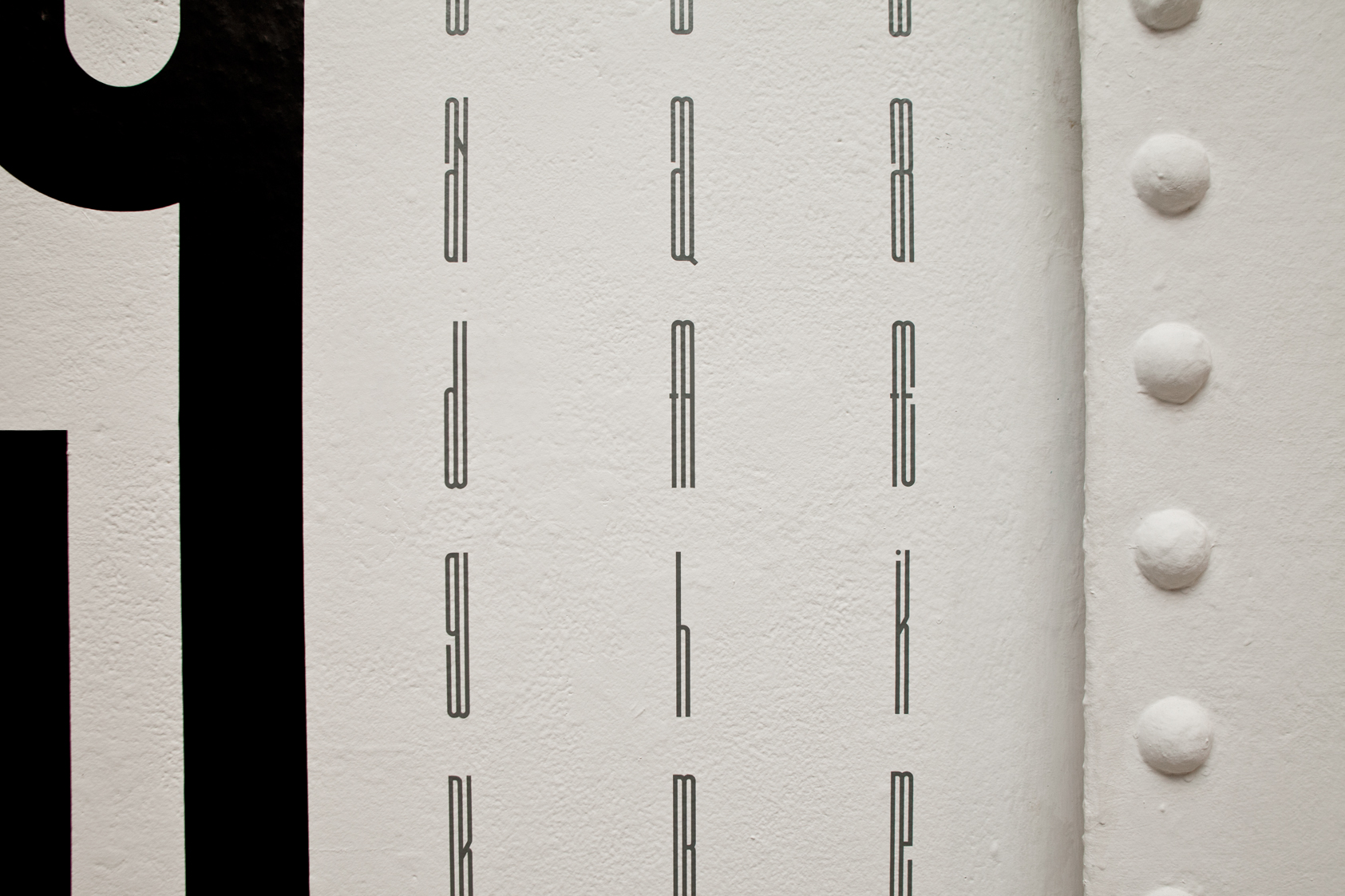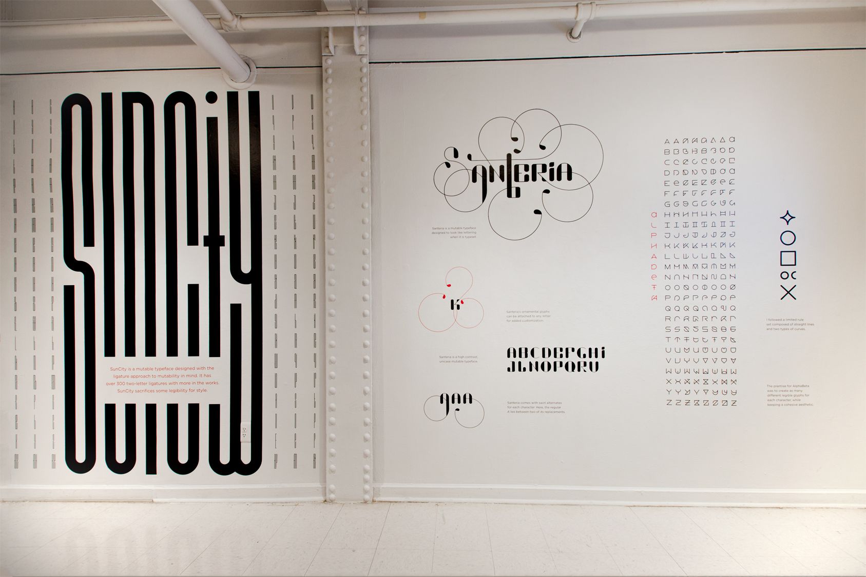 Geometry has played an important role in the mutable typefaces I've designed so far. In SunCity, the constant height of the unicase block glyphs simplifies the structure. The letterspacing and counter width (the negative space inside letters like A, B, or D) are the same on every glyph, and the stems are always the same thickness. This allowed me to focus on its mutability without worrying about kerning–the space between two individual letters–or the color–how dark one character might look in relation to another.
